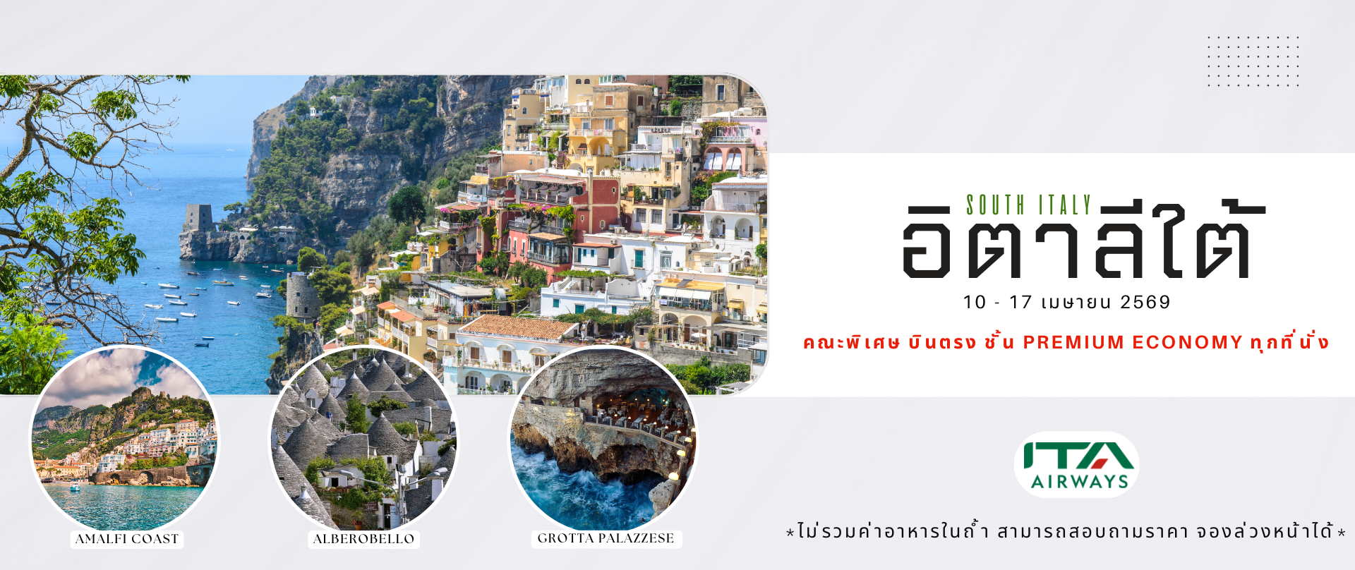 10 - 17 เมษายน 2569 บินตรงไป-กลับ กรุงโรม ชั้น Premium Economy Class ทุกที่นั่ง สัมผัสความงามเหนือกาลเวลาแห่งอิตาลีใต้ Bari – Sorrento เมืองเก่าแต่เก๋า เต็มไปด้วยมนตร์เสน่ห์ของอดีตและความวิจิตรศิลป์สไตล์อิตาเลียนแท้ และความยิ่งใหญ่ของธรรมชาติ ชายฝั่ง Amalfi Coast เส้นทางโรแมนติกเลียบทะเลที่สวยที่สุดในโลก