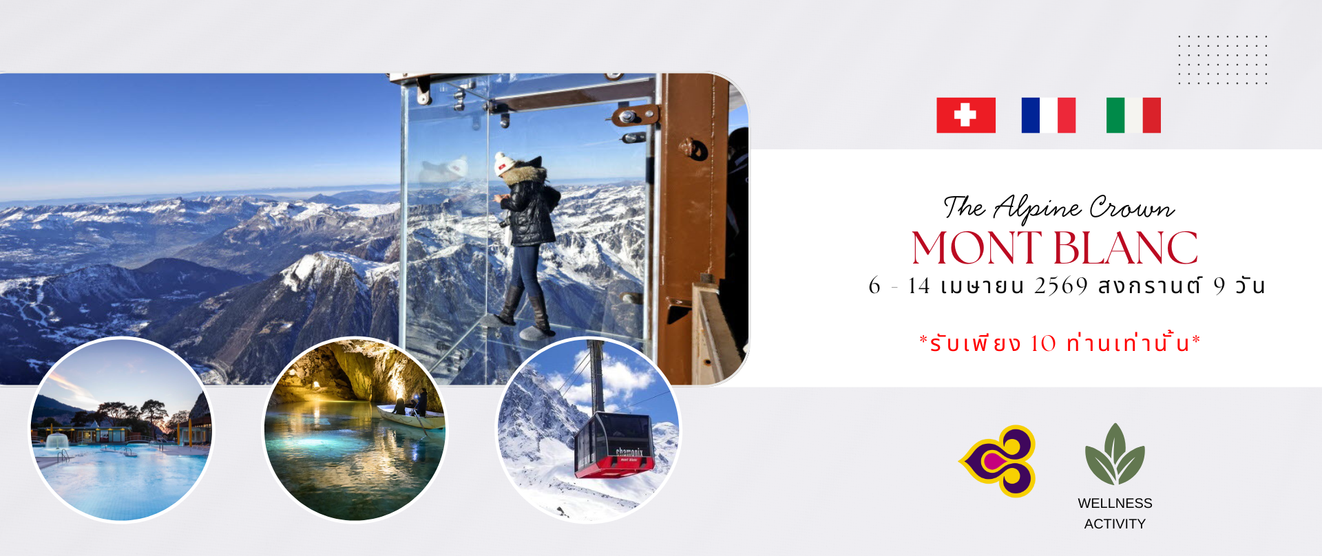 6 - 14 เมษายน 2569 สัมผัสความยิ่งใหญ่ของเทือกเขาแอลป์แบบครบทุกรสชาติ พิชิตยอดเขามงบล็อง ยอดเขาที่สูงที่สุดในยุโรป และธารน้ำแข็งอเลิท์ซ กลาเซียร์ ที่ใหญ่ที่สุดในเทือกเขาแอลป์ พร้อมผ่อนคลายในสวิตเซอร์แลนด์ แช่น้ำพุร้อนที่เมืองสปา Lavey les Bains และเพลิดเพลินกับ เบลลาจิโอ เมืองไข่มุกแห่งทะเลสาบโคโม อิตาลี